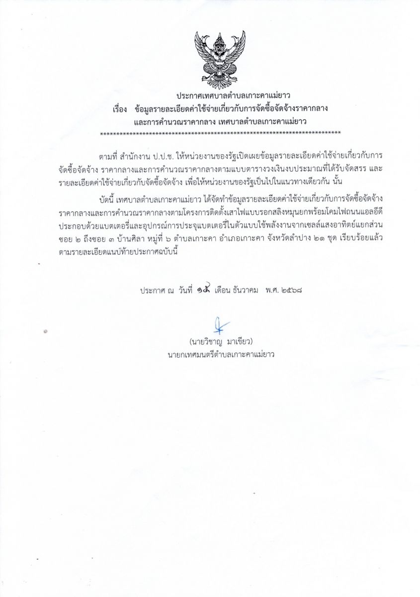 ประกาศเทศบาลตำบลเกาะคาแม่ยาว เรื่องประกาศราคากลาง โครงการติดตั้งเสาไฟแบบรอกสลิงหมุนยกพร้อมโคมไฟถนนแอลอีดีประกอบด้วยแบตเตอรี่และอุปกรณ์การประจุแบตเตอรี่ในตัวแบบใช้พลังงานจากเซลล์แสงอาทิตย์แยกส่วน ซอย ๒ ถึงซอย ๓ บ้านศิลา หมู่ที่ ๖ ตำบลเกาะคา อำเภอเกาะคา จังหวัดลำปาง ๒๑ ชุด
