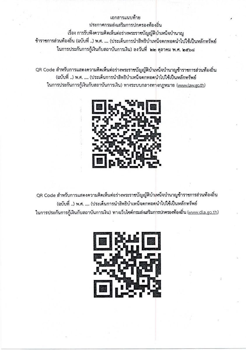 ประชาสัมพันธ์ ประกาศกรมส่งเสริมการปกครองท้องถิ่น เรื่อง การรับฟังความคิดเห็นต่อร่างพระราชบัญญัติบัเหน็จบำนาญข้าราชการส่วนท้องถิ่นฯ สามารถสแกน QR Code เพื่อแสดงความคิดเห็นต่อร่าง พรบ ฯ ตามหนังสือแนบมานี้
