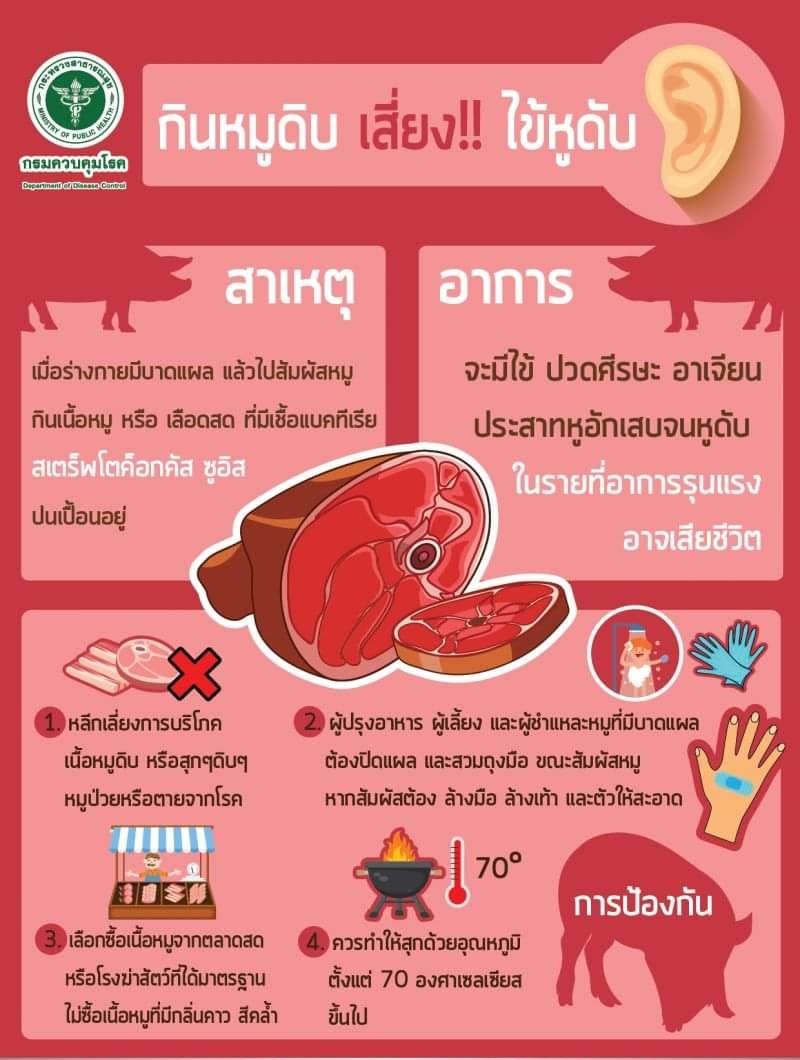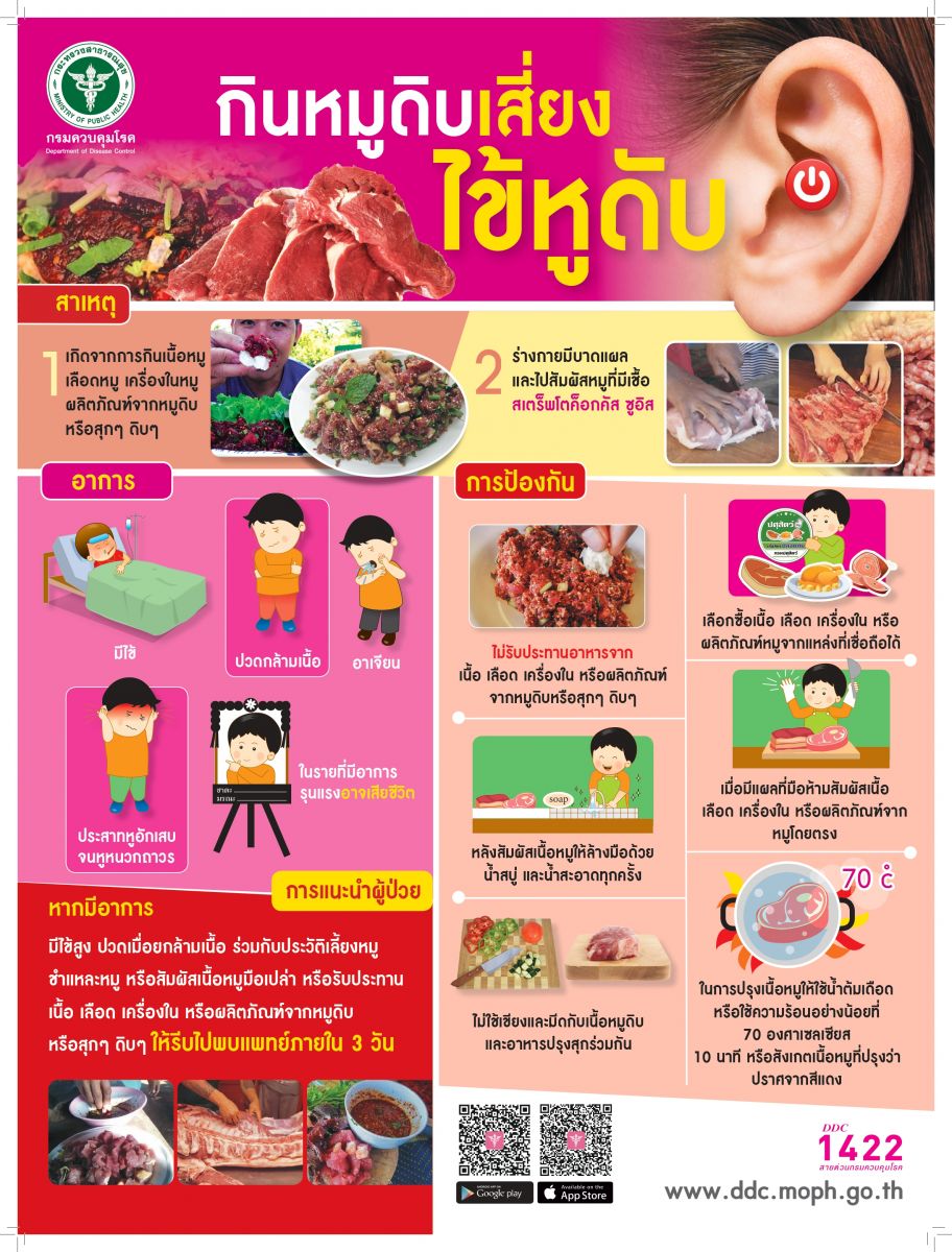 สำหรับผู้ป่วยที่มีอาการไข้สูง ปวดศีรษะอย่างรุนแรง เวียนศีรษะจนทรงตัวไม่ได้ อาเจียน คอแข็ง หูหนวก ท้องเสีย ปวดเมื่อยกล้ามเนื้อ ภายหลังสัมผัสหมูที่ป่วยหรือหลังกินอาหารที่ปรุงมาจากเนื้อหมูดิบ หรือสุกๆ ดิบๆ ให้รีบพบแพทย์ทันทีและบอกประวัติการกินหมูดิบให้ทราบ เพราะหากมาพบแพทย์เร็วจะช่วยลดอัตราการหูหนวกและการเสียชีวิตได้