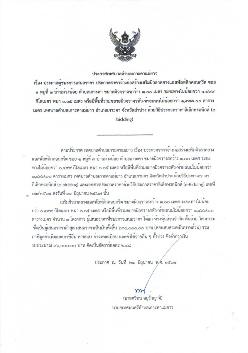 ประชาสัมพันธ์ เรื่อง ประกาศผู้ชนะการเสนอราคา ประกวดราคาจ้างก่อสร้างเสริมผิวลาดยางแอสฟัลท์ติกคอนกรีต ซอย 1 หมู่ที่ 3 บ้านม่วงน้อย ตำบลเกาะคา ขนาดผิวจราจรกว้าง 3.00 เมตร ระยะทางไม่น้อยกว่า 0.499 กิโลเมตร หนา 0.05 เมตร หรือมีพื้นที่รวมขยายผิวจราจรหัว-ท้ายถนนไม่น้อยกว่า 1,497 .00 ตารางเมตร เทศบาลตำบลเกาะคาแม่ยาว อำเภอเกาะคา จังหวัดลำปาง ด้วยวิธีประกวดราคาอิเล็กทรอนิกส์ (e-bidding)