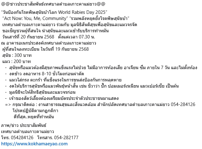 ข่าวประชาสัมพันธ์เทศบาลตำบลเกาะคาแม่ยาว “วันป้องกันโรคพิษสุนัขบ้าโลก World Rabies Day 2025”