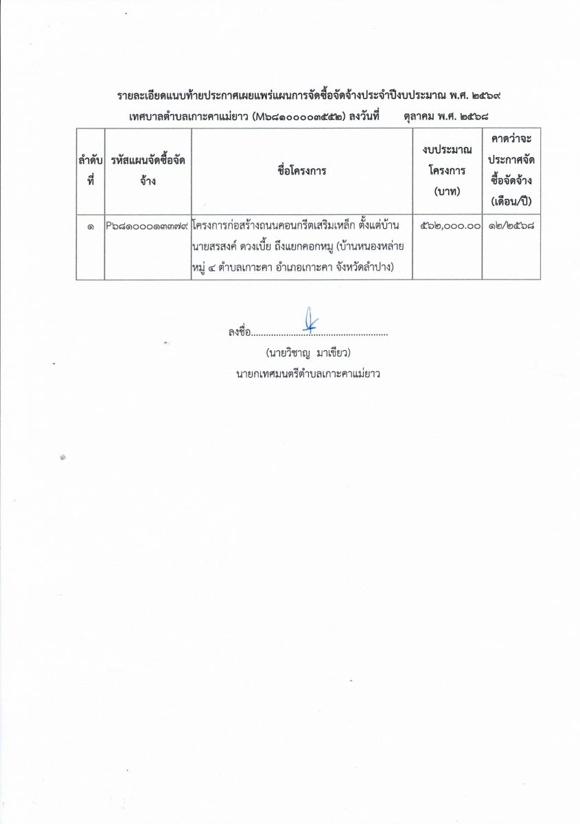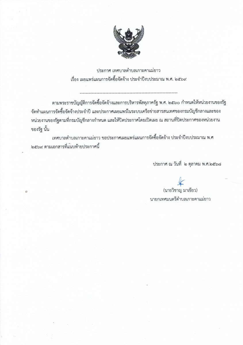 ประกาศเทศบาลตำบลเกาะคาแม่ยาว เรื่อง เผยแพร่แผนการจัดซื้อจัดจ้าง ประจำปี พ.ศ.๒๕๖๙