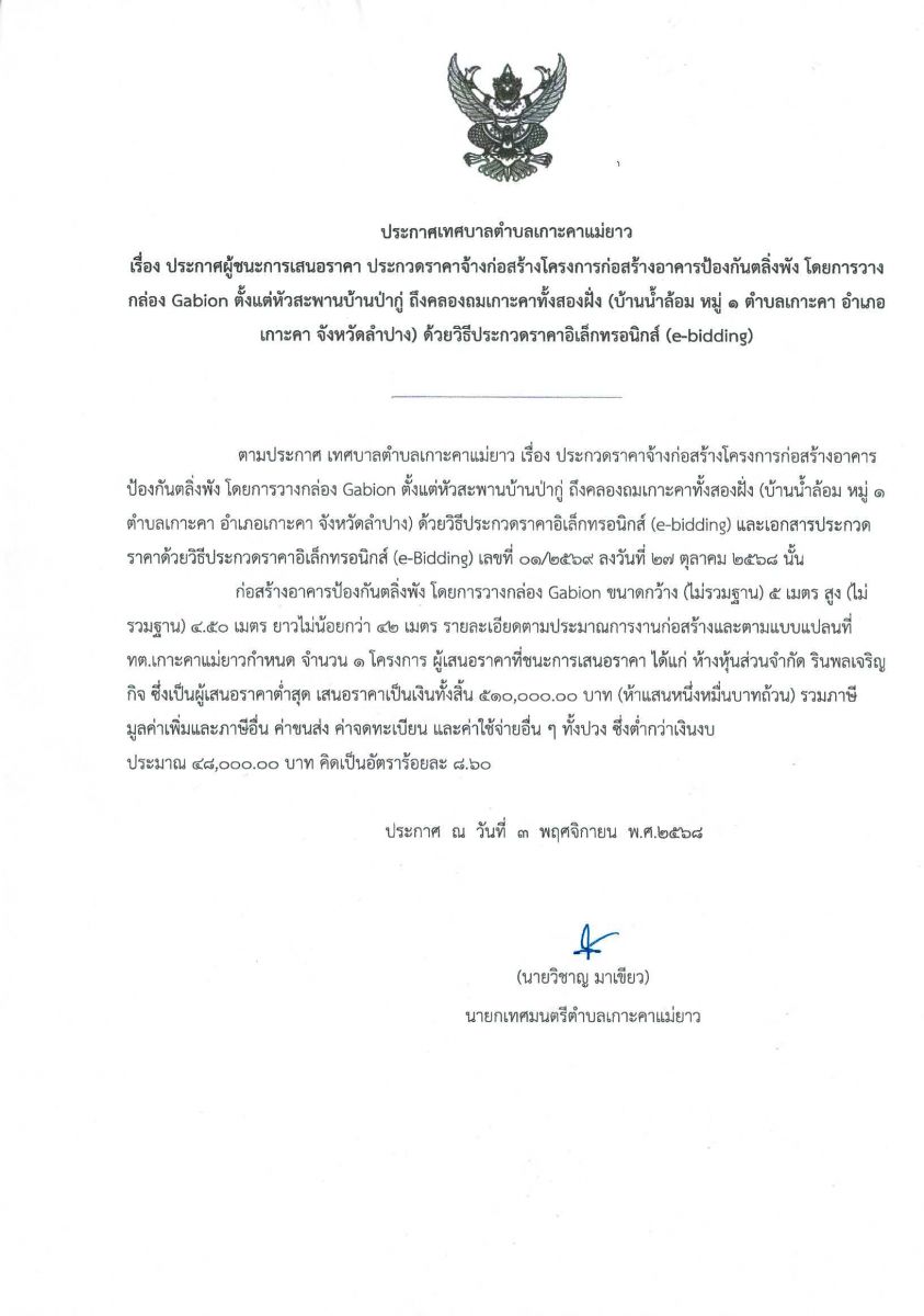 ประกาศเทศบาลตำบลเกาะคาแม่ยาว เรื่อง ประกาศผู้ชนะการเสนอราคาประกวดราคาจ้างก่อสร้างโครงการก่อสร้างอาคารป้องกันตลิ่งพัง โดยการวางกล่อง Gabion ตั้งแต่หัวสะพานบ้านป่ากู่ ถึงคลองถมเกาะคาทั้งสองฝั่ง (บ้านน้ำล้อม หมู่ 1 ตำบลเกาะคา อำเภอเกาะคา จังหวัดลำปาง) ด้วยวิธีประกวดราคาอิเล็กทรอนิกส์ (e-bidding)