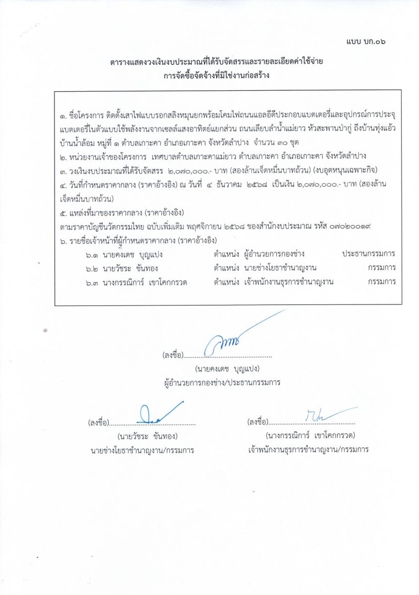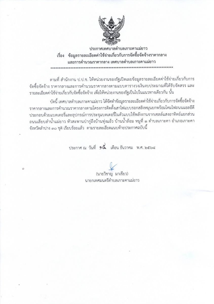 ประกาศเทศบาลตำบลเกาะคาแม่ยาว เรื่องประกาศราคากลาง โครงการติดตั้งเสาไฟแบบรอกสลิงหมุนยกพร้อมโคมไฟถนนแอลอีดีประกอบด้วยแบตเตอรี่และอุปกรณ์การประจุแบตเตอรี่ในตัวแบบใช้พลังงานจากเซลล์แสงอาทิตย์แยกส่วนถนนเลียบลำน้ำแม่ยาว หัวสะพานป่ากู่ถึงบ้านทุ่งแอ้วบ้านน้ำล้อม หมูที่ ๑ ตำบลเกาะคา อำเภอเกาะคา จังหวัดลำปาง ๓๐ ชุด