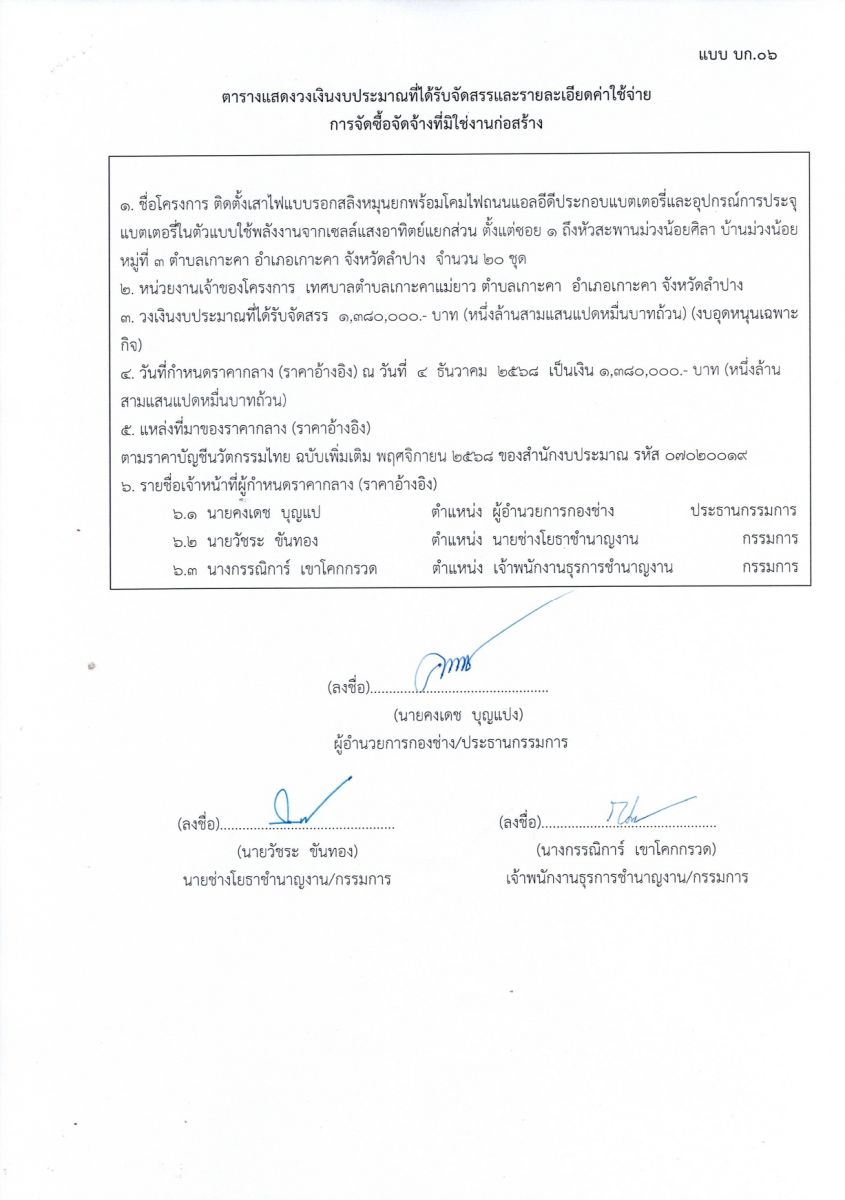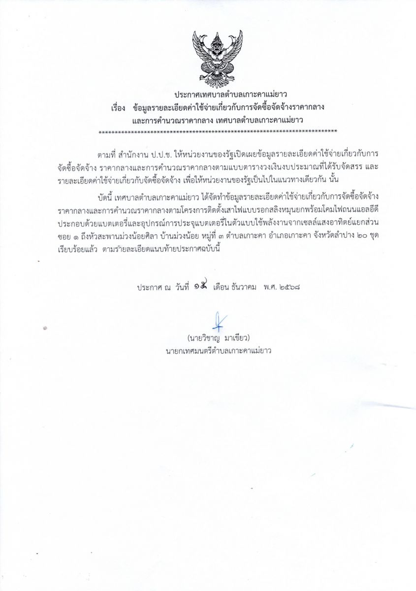 ประกาศเทศบาลตำบลเกาะคาแม่ยาว เรื่องประกาศราคากลาง โครงการติดตั้งเสาไฟแบบรอกสลิงหมุนยกพร้อมโคมไฟถนนแอลอีดีประกอบด้วยแบตเตอรี่และอุปกรณ์การประจุแบตเตอรี่ในตัวแบบใช้พลังงานจากเซลล์แสงอาทิตย์แยกส่วน ซอย ๑ ถึงหัวสะพานม่วงน้อยศิลา บ้านม่วงน้อย หมู่ที่ ๓ ตำบลเกาะคา อำเภอเกาะคา จังหวัดลำปาง ๒๐ ชุด