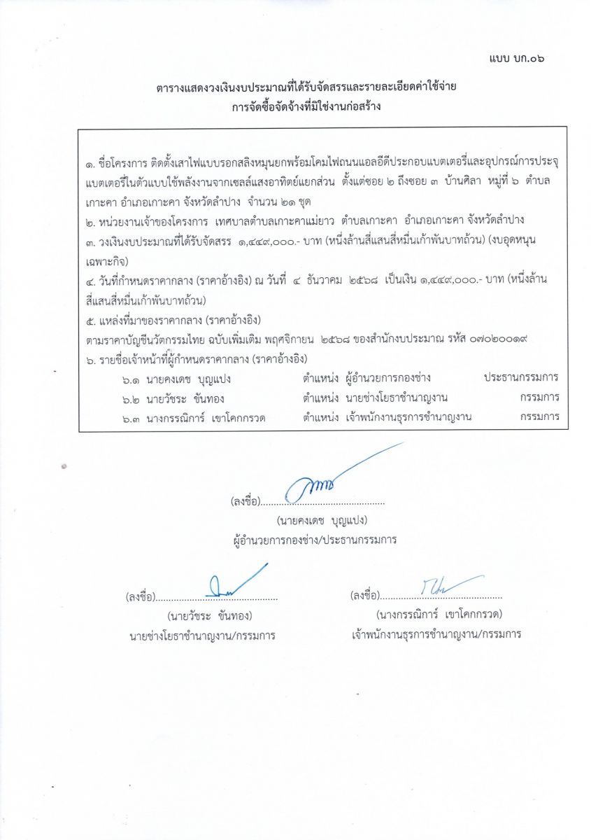 ประกาศเทศบาลตำบลเกาะคาแม่ยาว เรื่องประกาศราคากลาง โครงการติดตั้งเสาไฟแบบรอกสลิงหมุนยกพร้อมโคมไฟถนนแอลอีดีประกอบด้วยแบตเตอรี่และอุปกรณ์การประจุแบตเตอรี่ในตัวแบบใช้พลังงานจากเซลล์แสงอาทิตย์แยกส่วน ซอย ๒ ถึงซอย ๓ บ้านศิลา หมู่ที่ ๖ ตำบลเกาะคา อำเภอเกาะคา จังหวัดลำปาง ๒๑ ชุด