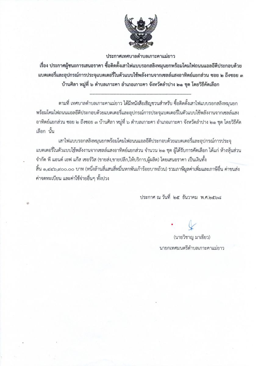 ประกาศเทศบาลตำบลเกาะคาแม่ยาว เรื่อง ประกาศผู้ชนะการเสนอราคาโครงการติดตั้งเสาไฟแบบรอกสลิงหมุนยกพร้อมโคมไฟถนนแอลอีดีประกอบด้วยแบตเตอรี่และอุปกรณ์การประจุแบตเตอรี่ในตัวแบบใช้พลังงานจากเซลล์แสงอาทิตย์แยกส่วน ซอย 2 ถึงซอย 3 บ้านศิลา หมู่ที่ 6 ตำบลเกาะคา อำเภอเกาะคา จังหวัดลำปาง 21 ชุด