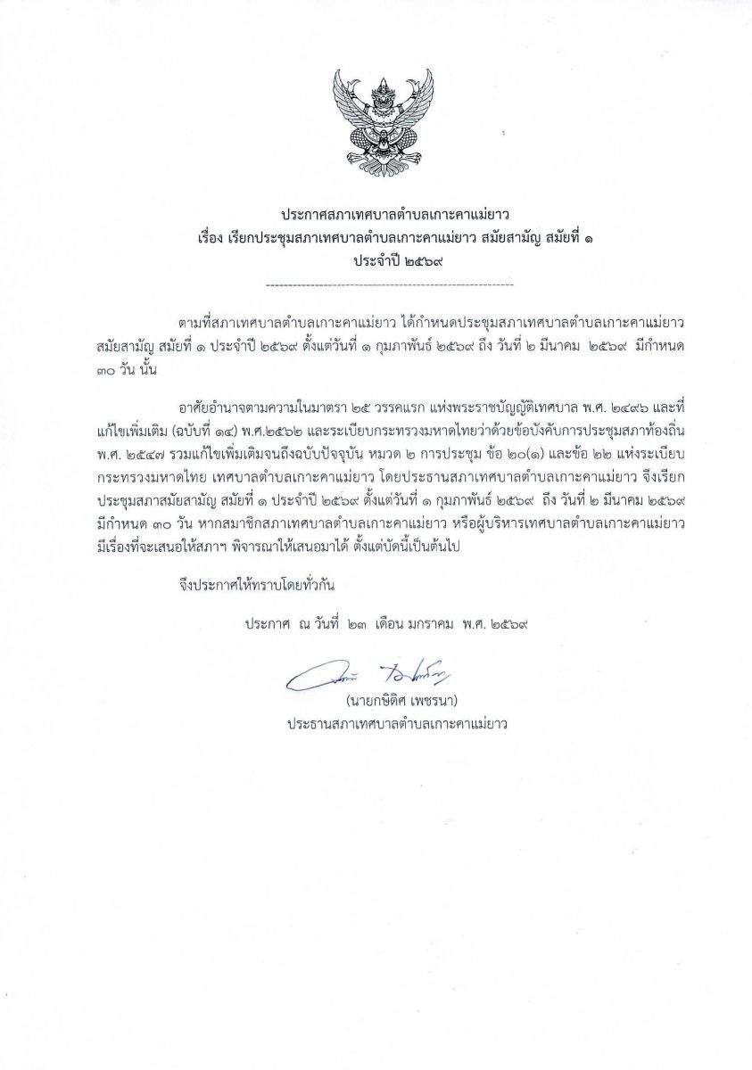 ประกาศสภาเทศบาลตำบลเกาะคาแม่ยาว เรื่อง เรียกประชุมสภาเทศบาลตำบลเกาะคาแม่ยาว สมัยสามัญ สมัยที่ 1 ประจำปี 2569